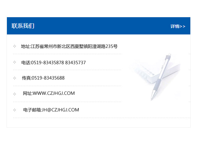 地址:常州市新北區(qū)友邦商務(wù)大廈1幢16、17層  電話:0519-85101652  傳真:0519-85112595  郵編:213022  網(wǎng)址:www_cz-jiayue_cn.xccsy.com  郵箱:xiajifengaa@163.com